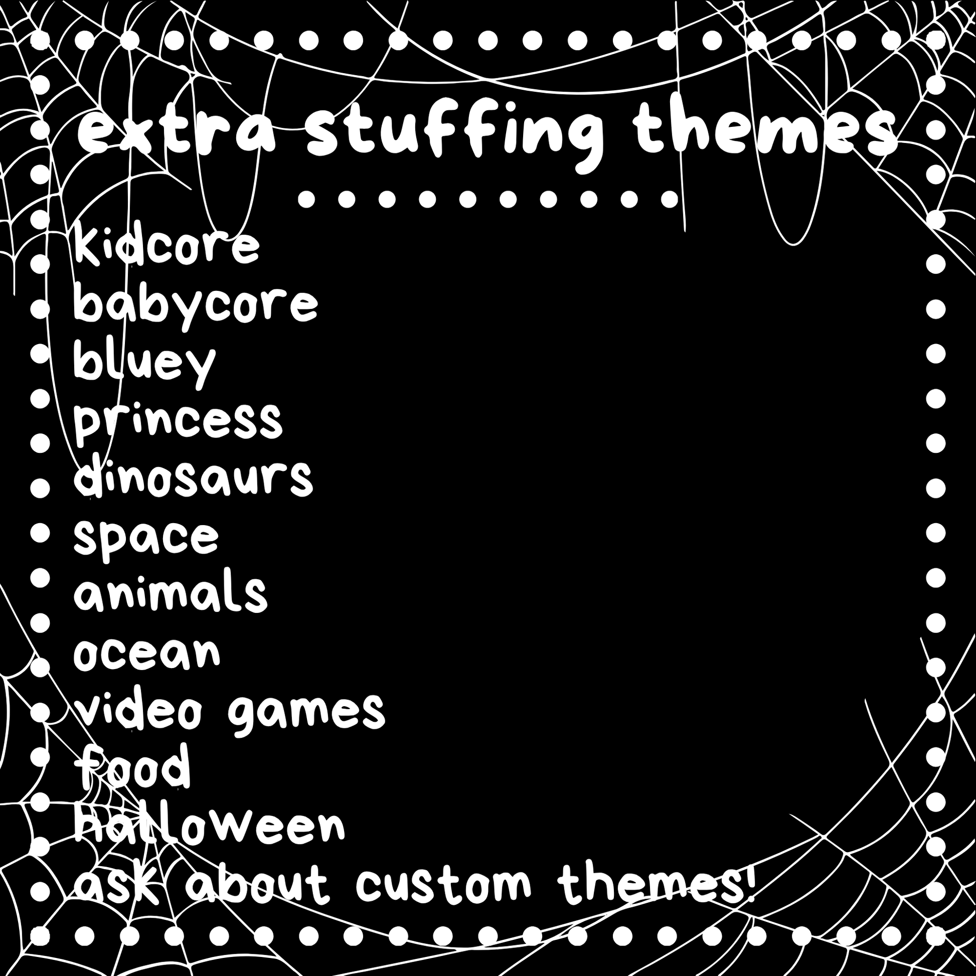 - add on extra stuffing for $15 extra for regular, or $20 extra for deluxe for added discreetness and for more fun surprises inside of your stuffie!