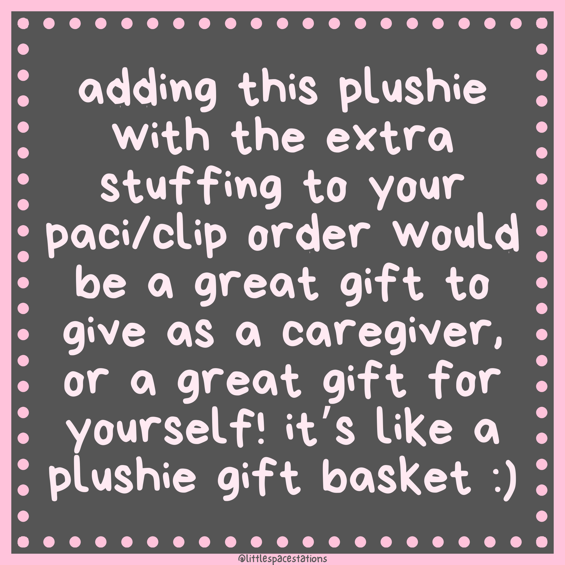 - you can add this plushie to any paci or clip order, and your pacifier/clip will come inside