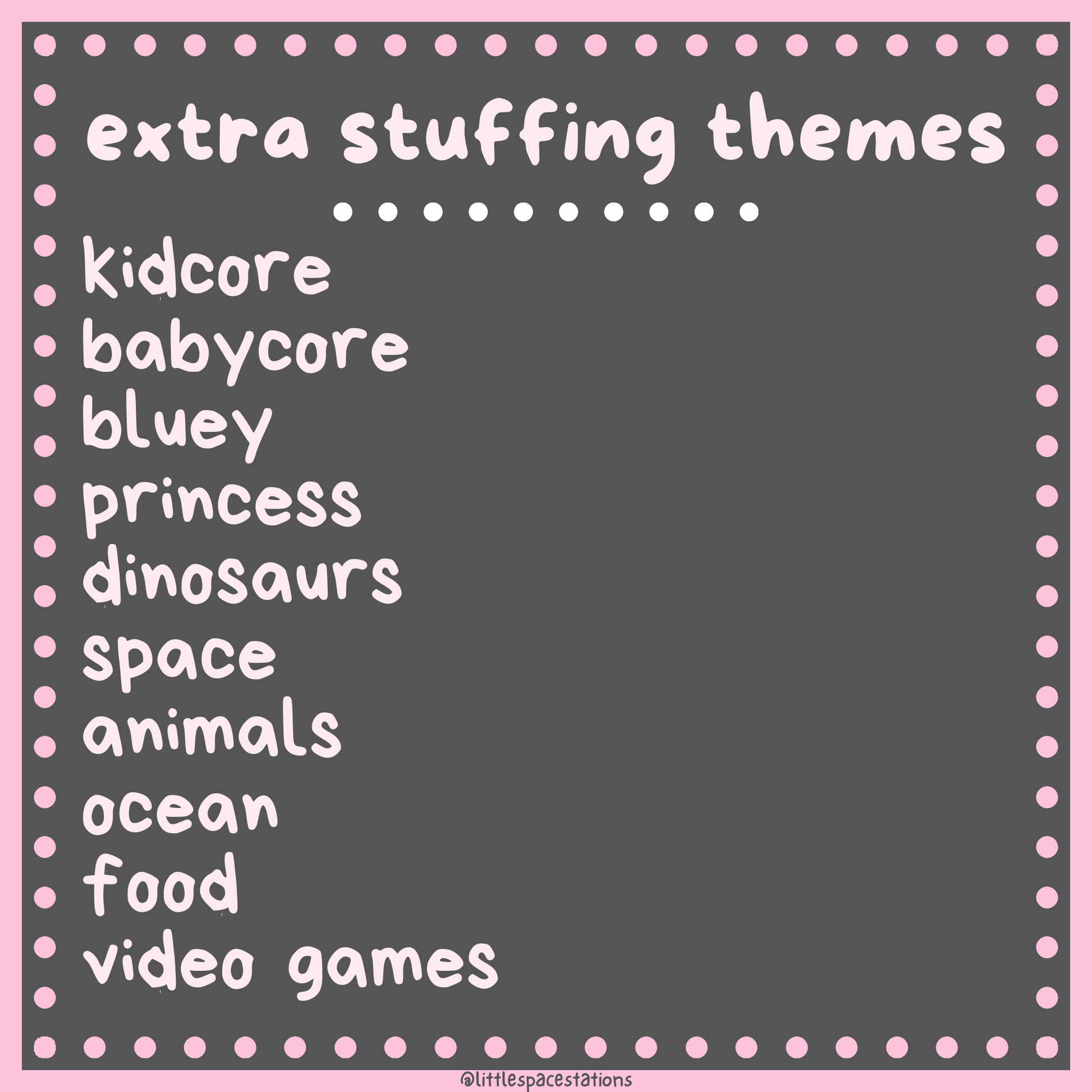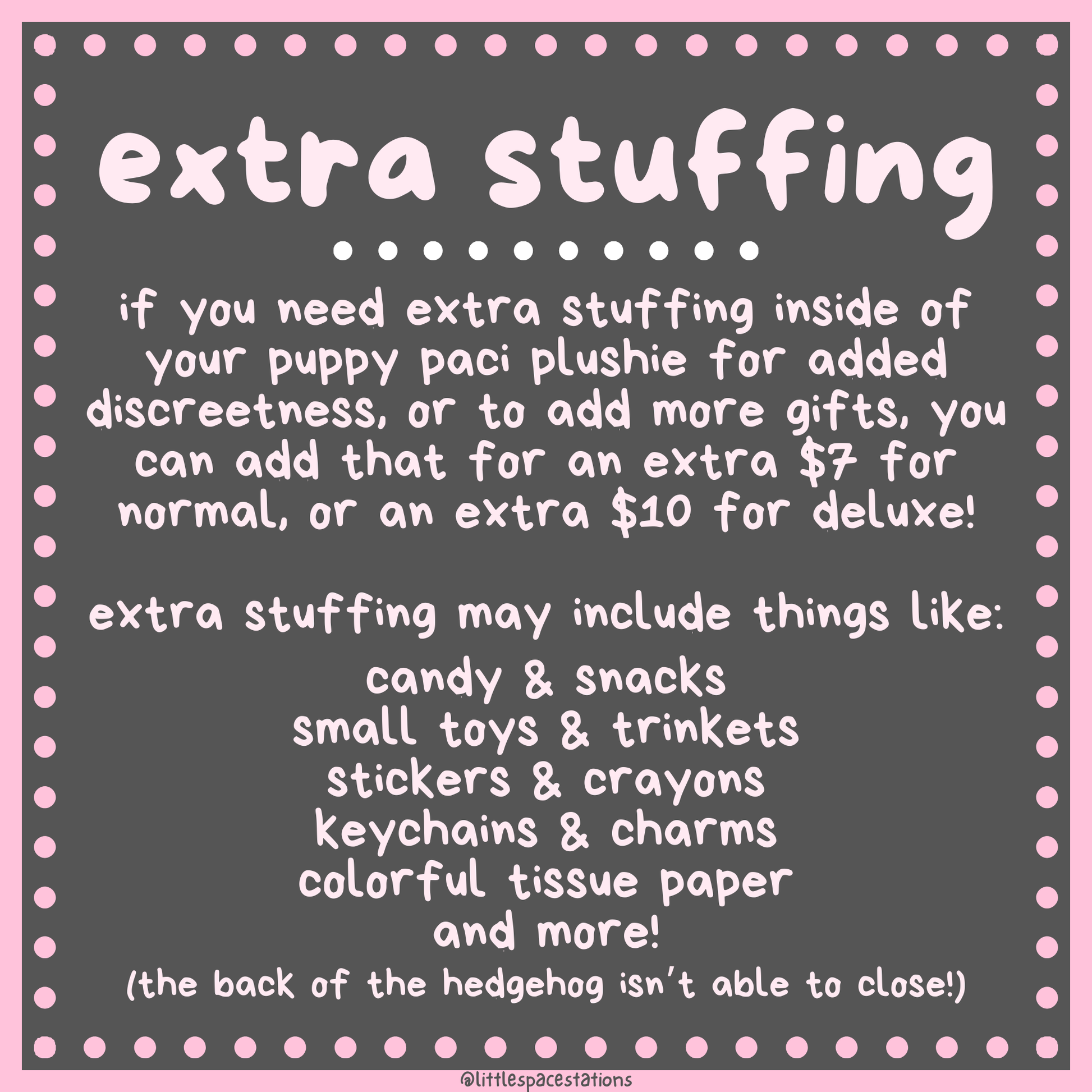 - add on extra stuffing for $7 extra for regular, or $10 extra for deluxe for added discreetness and for more fun surprises inside of your stuffie!
