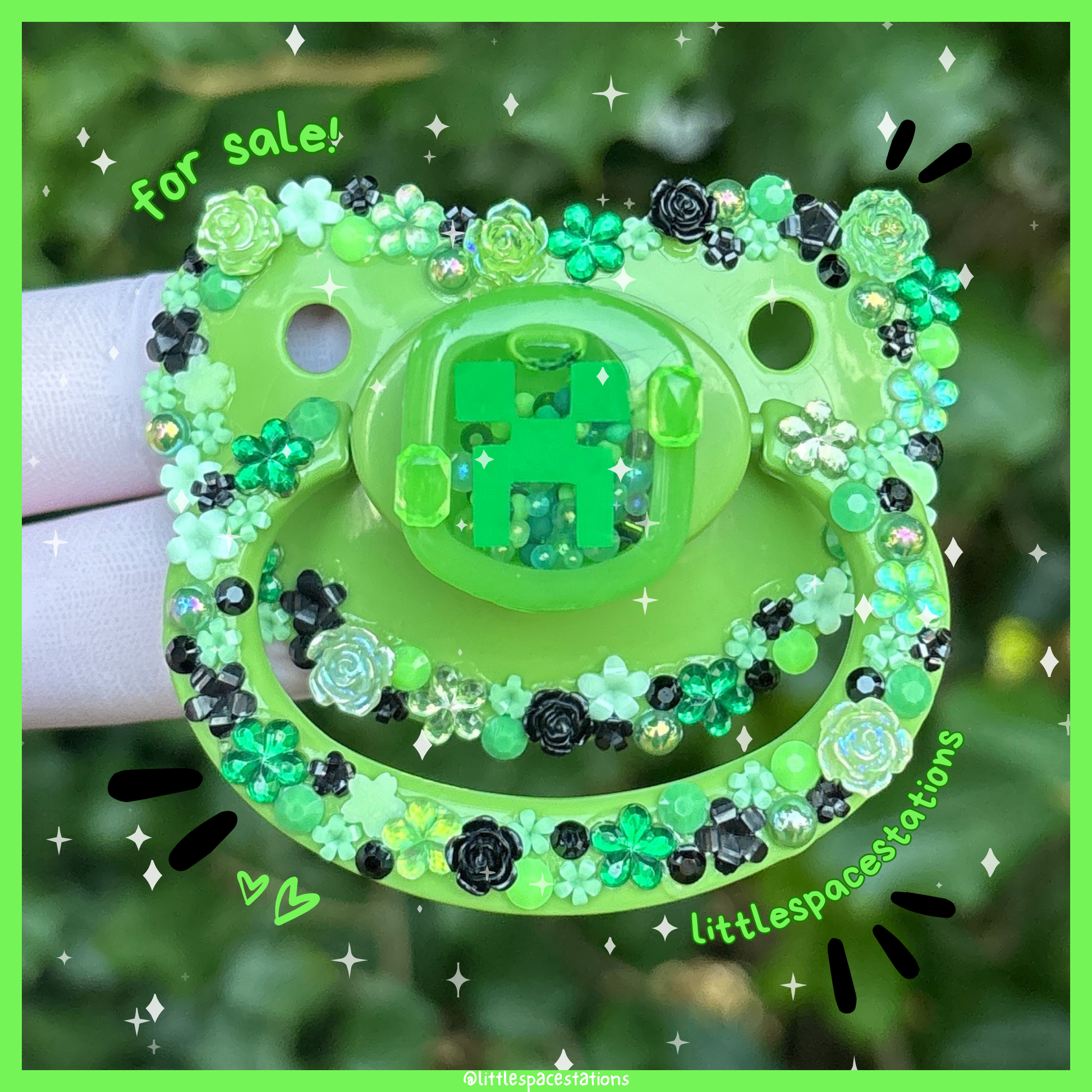 as each pacifier is handmade, minor imperfections may occur. these can include small scratches, glue spots, misplaced gems, misaligned centerpieces, and other minor imperfections. rest assured, each one is crafted with love and care!