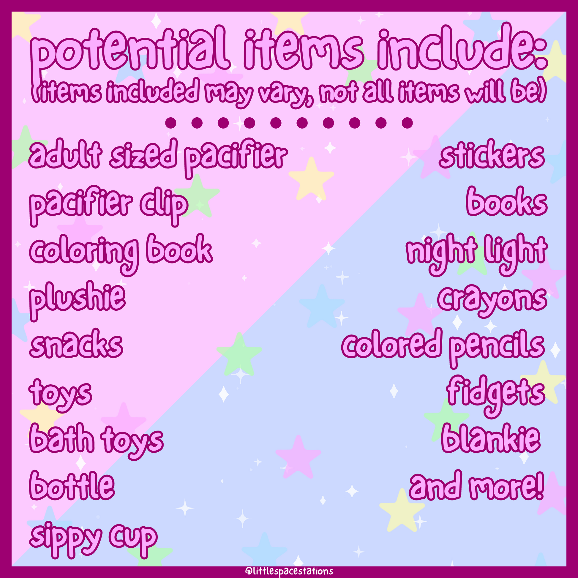 begin your little space journey with this starter pack! the amount of items selected for you will be based on the tier level you choose! help your regression with this fun box of items!