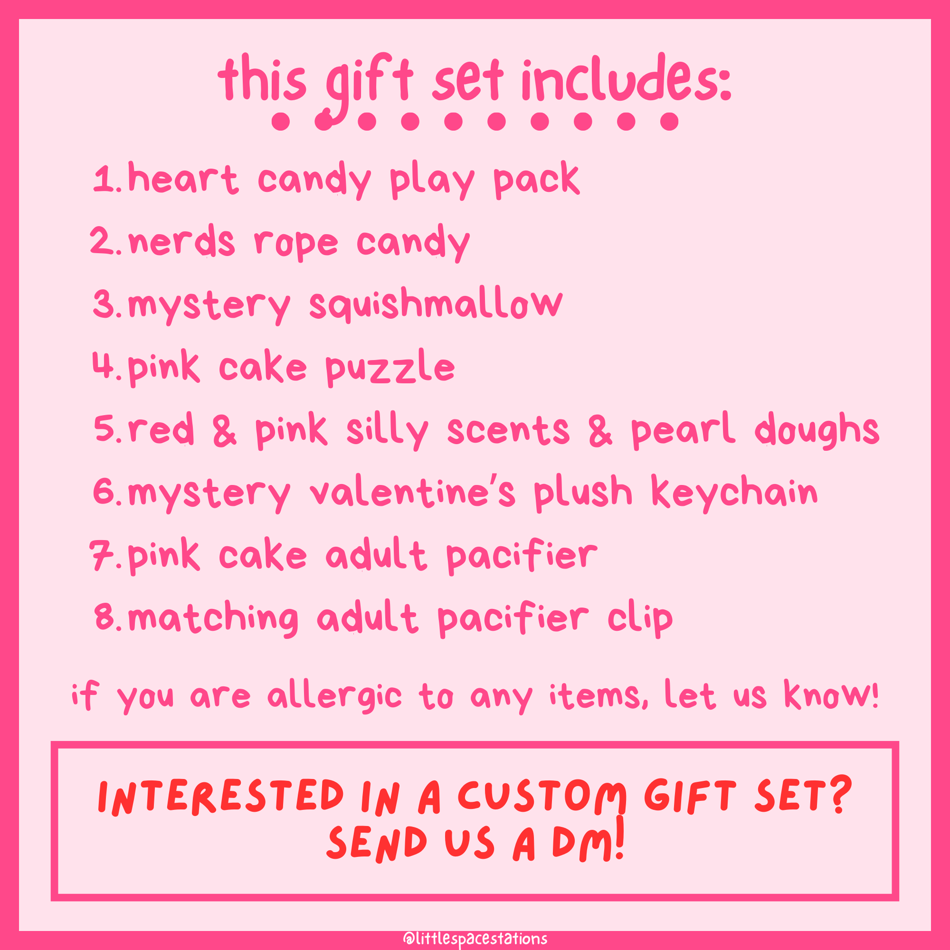 show your little one you care with this cake themed valentine's gift set. It includes ten (10) pre-selected valentine's themed items for you! give your little one the perfect valentine's day gift with this fun set of items!